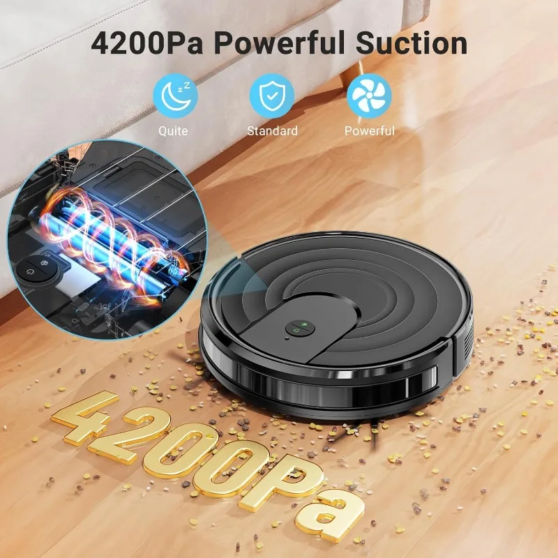 - 【4200Pa Super Suction Power, No Clogging Troubles】MBYULO 2025 robot vacuum cleaner is equipped with the latest brushless motors and high sensitivity sensors, with a speed of up to 26,500 RPM, 4200Pa strong suction power to effectively clean the floor of garbage and dust. Unique air inlet design won’t get clogged by pet hair like other robot vacuum cleaners with roller brush, ideal for pet families.
